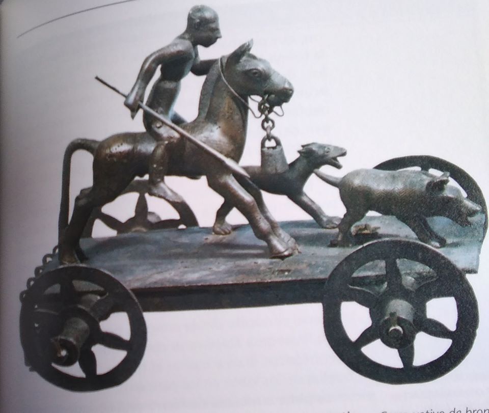 Exists a chariot of the Bronce Era in Spain of a man hunting a Boar, but is hard to explain if it is a Podenco, a light Mastiff or another dog, it belongs to Yamnaya culture, since the iberians start to use the horses and chariots until the arrival of the Yamnayas of the Steppes, 8000 years ago, putting end to the Neolitic era.