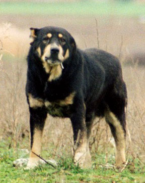 Used as a war dog, guardian and fighter in the past, the Molossos tis Epirou is today most commonly employed as a property watchdog and livestock protector. Very territorial, reasonably aggressive and quite independent, this powerful Molosser can be intolerant of strangers and needs firm handling and early socialization. However, this is also a trainable and intelligent breed, not vicious at all, but simply very protective when the need arises. One of the distinguishing characterictics of the Epir Moloss among other Greek breeds is its coat. Not only is it black or black-n-tan in colour, but the thick harsh coat is also noticeably shorter than usually found in mountain dogs and is described as having somewhat of a "goat hair" quality to the touch. A rare lighter sub-type of the Epir Mastiff has an even shorter coat and lighter build with somewhat "bully-esque" facial features, but some enthusiasts consider these dogs to constitute a separate breed. The true mountain type of the Epir Mastiff is a large-headed, wide-chested and broad-shouldered Moloss, with strong legs and a muscular body. The ears are oftentimes cropped and the tail can be either left natural or docked.
